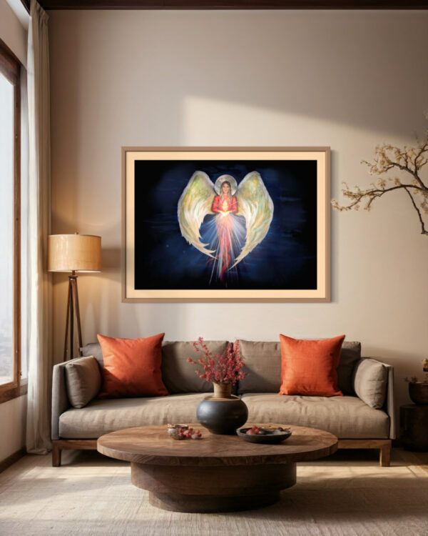 Dieses beeindruckende Kunstwerk zeigt einen Engel mit ausgebreiteten, leuchtenden Flügeln und einem strahlenden goldenen Licht, das Wärme und Segen ausstrahlt. Die sanfte Farbpalette in Kombination mit goldenen und silbernen Akzenten bringt eine beruhigende und kraftvolle Energie in jeden Raum. Das Original ist ein Unikat, es ist mit Blattgold und echtem Platin veredelt und wurde mit Ölfarbe auf Leinwand von Simone Amon gemalt. Der Engel ist perfekt geeignet für Menschen, die spirituelle Kunst schätzen und einen spirituellen Anker in ihrem Zuhause schaffen möchten. Engel sind Lichtbringer, sie unterstützen Dich bei der Meditation, beim Gebet und schaffen ein angenehmes Umfeld. Deshalb haben wir für Dich einen wunderschönen Druck auf einer edel schimmernden Untergrund gestaltet.